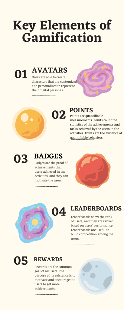 As the infographic shows, there are 5 key elements of gamification, which are avatars, points, badges, leaderboards and rewards. According to Dichev and Dicheva (2017), gamification used in education is in order to encourage the students’ motivation and engagement by applying game principles to the learning environment.